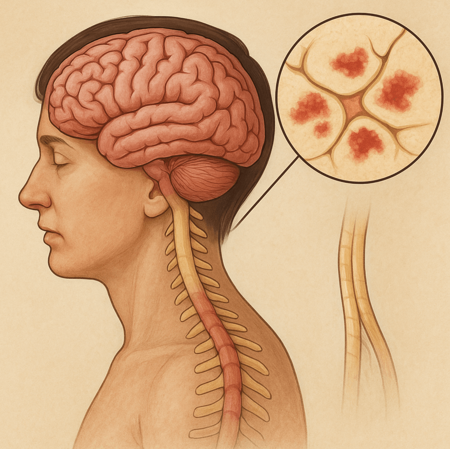 Организм начинает атаковать собственную нервную ткань, что приводит к воспалению и повреждению миелина — оболочки, защищающей нервные волокна. В результате нарушается передача сигналов в нервной системе, и у человека возникают тяжёлые неврологические симптомы.